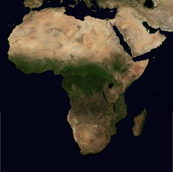 תמונת לווין של אפריקה: יערות הגשם נראים כרצועה הכהה במרכז היבשת, בחלק